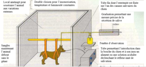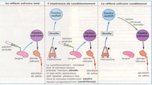 - Quelques heures après, l’expérimentateur fait sonner le métronome et donne des aliments au chien, il salive. L’expérimentateur répète plusieurs fois cette expérience et il se produit à chaque fois une salivation. A la longue le son du métronome sans apport d’aliment fait saliver le chien. Ce résultat est un réflexe conditionnel.