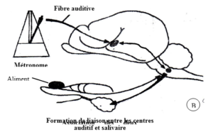Des liaisons se créent entre les centres auditif et salivaire lors de l’association du métronome (stimulus neutre) et de l’aliment (stimulus absolu).