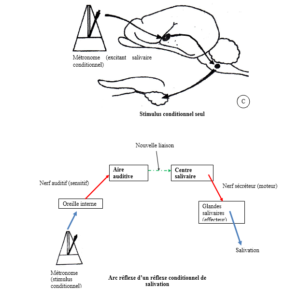 Le métronome seul provoque la salivation. En effet, de nouvelles liaisons se sont créées entre le centre auditif et le centre salivaire rendant le stimulus auditif efficace. Pavlov parle alors de réflexe salivaire conditionnel.