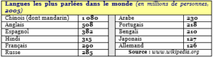 La langue est un système de signes linguistiques, vocaux, graphiques ou gestuels qui permet la communication entre les individus. La langue est une composante importante d’une civilisation. Il est impossible de déterminer avec précision le nombre de langues parlées dans le monde, en raison de la difficulté qu’il y a à tracer les frontières précises entre les langues, notamment à différencier les langues des dialectes. Selon les estimations, il existerait entre 3 000 et 7 000 langues vivantes à la surface du globe mais un tiers (1/3) d’entre elles sont parlées par moins de 1 000 personnes et donc menacées de disparition. Moyen d’expression d’une communauté, la langue est aussi vectrice de communication entre les sociétés. Une centaine de langues servent à l’expression de 95 % de la population mondiale et les cinq (5) les plus répandues (le chinois, l’anglais, l’hindi, l’espagnol et le français) sont parlées par près de la moitié de l’Humanité.