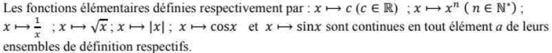 Toute fonction qui est somme, produit ou quotient de fonctions élémentaires, est continue en tout élément de son ensemble de définition.