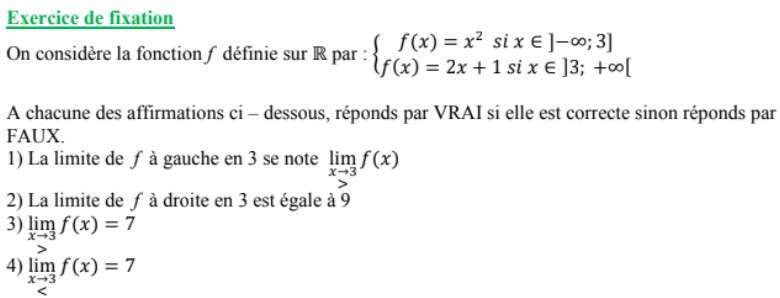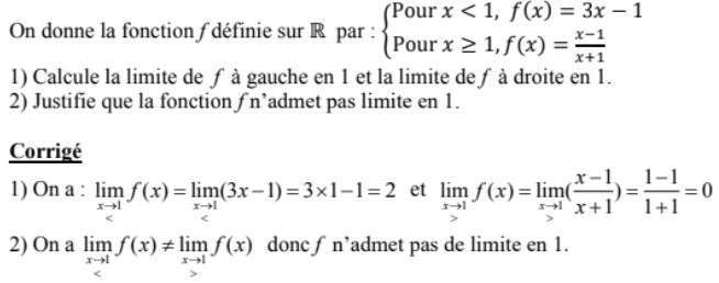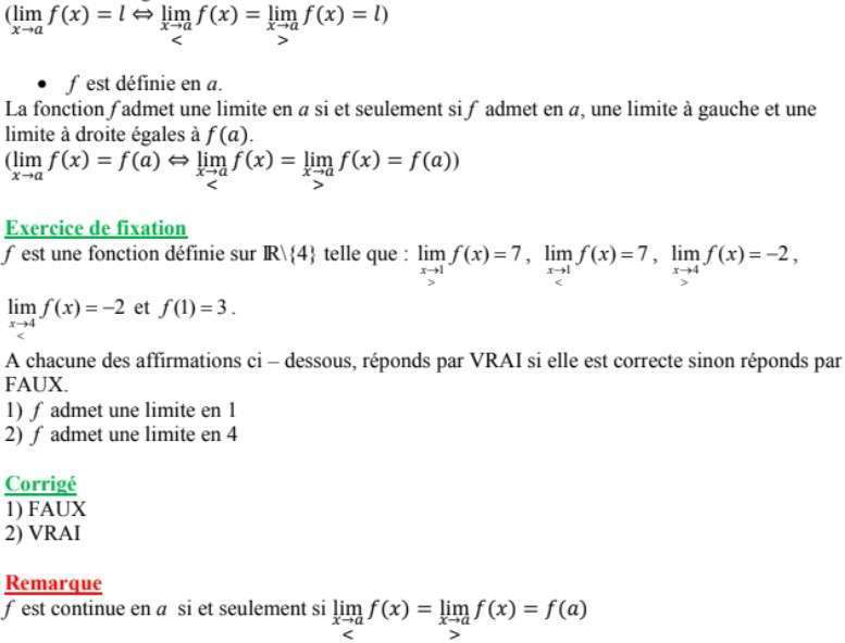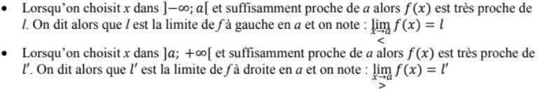 La fonction f admet une limite l en a si et seulement si ƒ admet en a, une limite à gauche et une limite à droite égales à l.