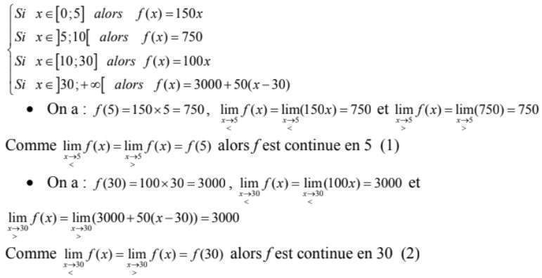 Dans leurs échanges l’ainé affirme que le contrat proposé par le gérant de la cabine traduit une fonction continue en 5 et discontinue en 30 mais son petit frère soutient que cette fonction est continue en 5 et en 30. Ils ont présenté cette situation à leurs camarades de classe qui n’ont pu départager. En tant qu’élève de 1èreC, ils te sollicitent. A l’aide d’une production argumentée, en utilisant tes connaissances mathématiques, indique lequel des deux frères a raison.
