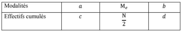 Précisément, la médiane est la modalité dont l’effectif cumulé est N/2 où N est l’effectif total.