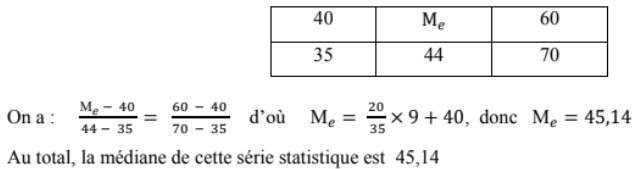• Pour déterminer algébriquement la médiane d’une série statistique regroupée en classes, on peut procéder comme suit :