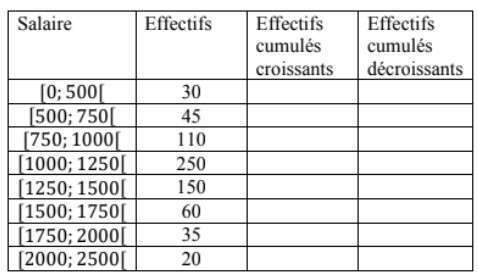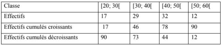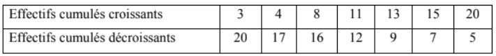 Les effectifs cumulés croissants et les effectifs cumulés décroissants sont consignés dans le tableau suivant :