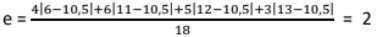 Cette série a un effectif pair (8). La médiane de cette série statistique correspond au centre de l’intervalle formé par les modalités de rangs 8/2 et 8/2 + 1 c’est-à-dire de rangs 4 et 5. La modalité de rang 4 est 11 et celle de rang 5 est 17. Donc la médiane est 11+17/2 c’est-à-dire 14.