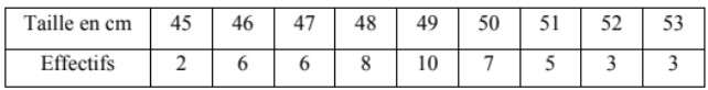 Dans une maternité, on mesure la taille de 50 nouveau-nés à 1 cm près. On a obtenu le tableau suivant :