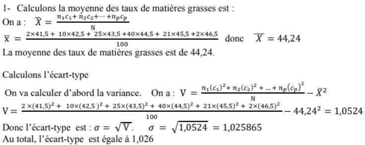 l’écart-type calculé (1,026) est inférieur à 1,5 et enfin le taux de matières grasses calculé soit 45, 85 est compris entre 42,188 et 46,292 ; ce qui est vrai.