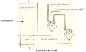 Loewi relie deux cœurs de grenouille A et B. Il perfuse ces cœurs avec du liquide de Ringer. Le cœur A par lequel passe le liquide, reste avec son nerf X. On suit le rythme cardiaque de ces deux cœurs grâce à un cardiographe.