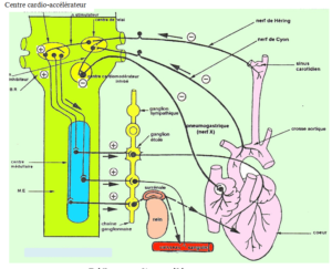 - L’hypotension entraine une faible production d’influx nerveux imperceptibles par le centre parasympathique qui devient inactivé. Le centre sympathique qui n’est plus inhibé provoque une tachycardie et une vasoconstriction entrainant une augmentation de la de la pression artérielle.